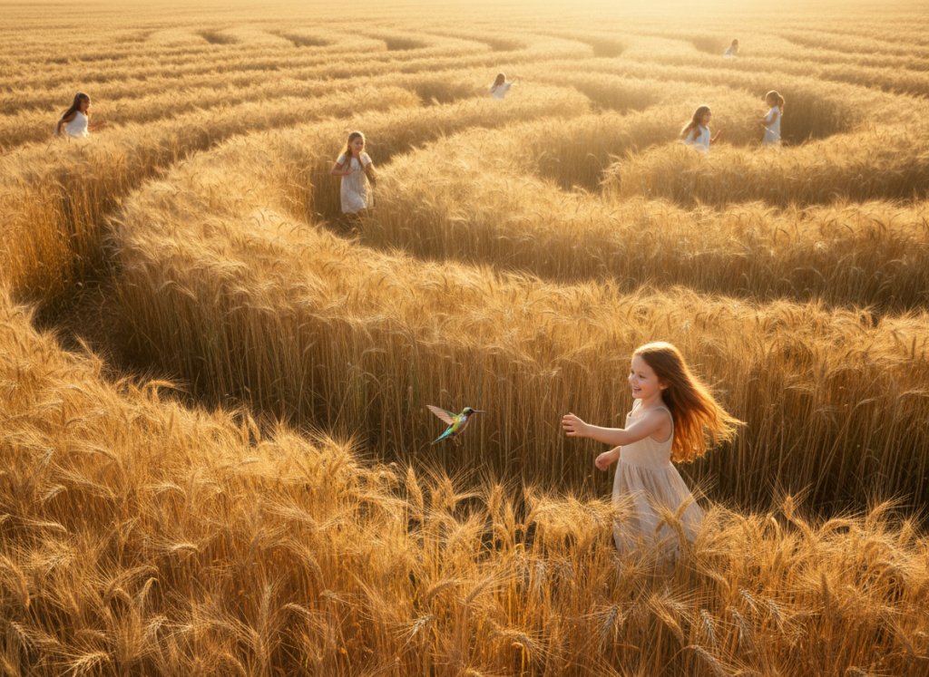 Schreiende, spielende Kinder nähern sich dem Feld. Wie die Heuschrecken fallen sie in das Feld ein, jolend und kreischend, vor Vorfreude auf das große Abenteuer. Die Mädchen und Jungen rennen in das Feld, der Boden ist staubtrocken und die Insekten wirbeln aufgeschreckt in der schwülen Nachmittagshitze, angesichts der kreischenden Horde. Die Kinder nutzen das Roggenfeld als Irrgarten. Eigentlich wissen sie, das dieses Feld für sie tabu ist, denn das Feld endet in einer steilen Klippe, die viele Meter steil bergab geht und im Meer endet. Aber der Reiz des Abenteuers und des Nervenkitzels lässt sie alle Vorsicht vergessen. Bis es langsam anfängt zu dämmern und sie den Weg nicht mehr hinaus finden. Panik macht sich breit. Die Jungen schreien und die Mädchen weinen. Wie können sie dem Irrgarten entkommen ohne die Klippen hinabzustürzen.
